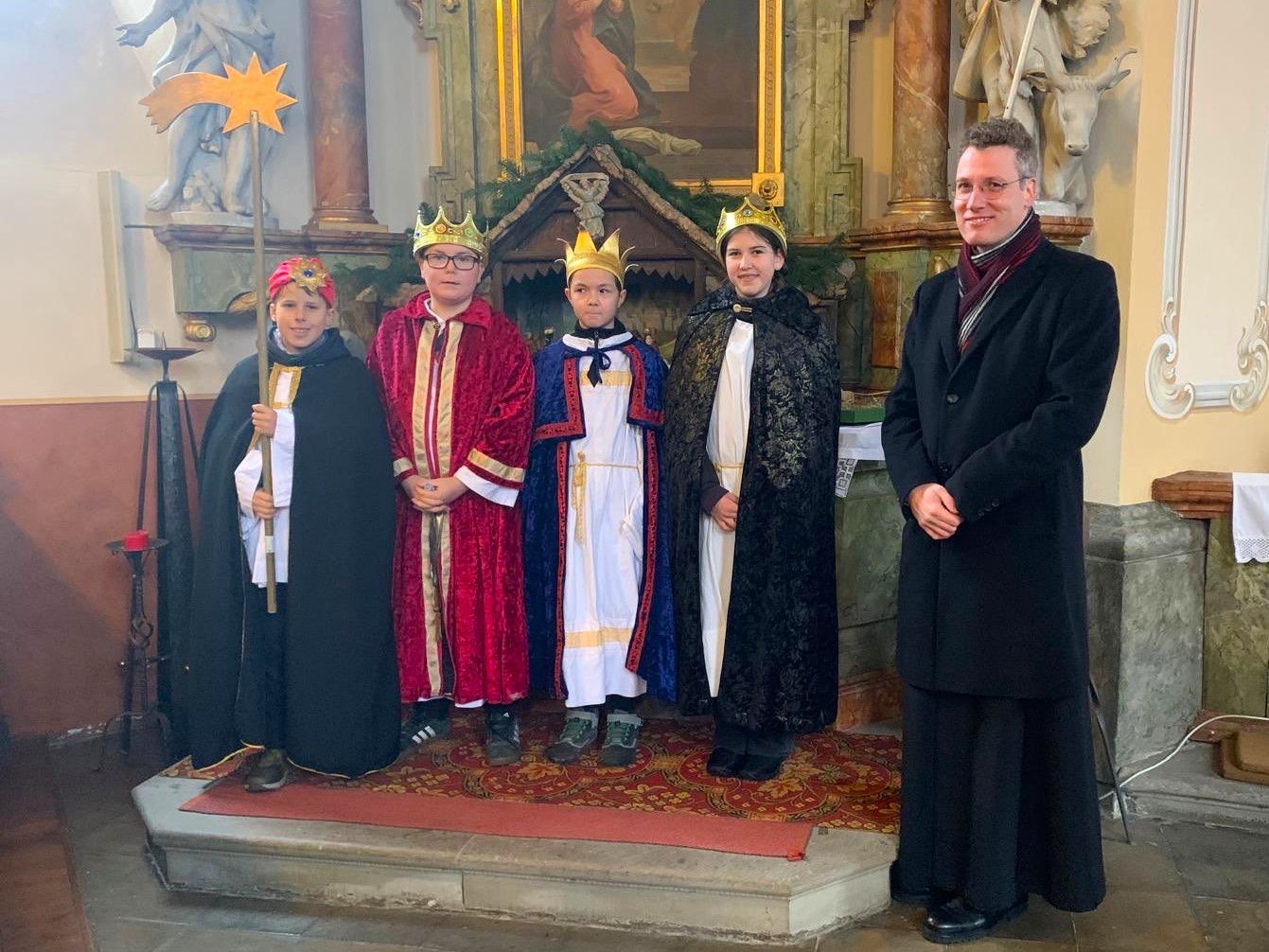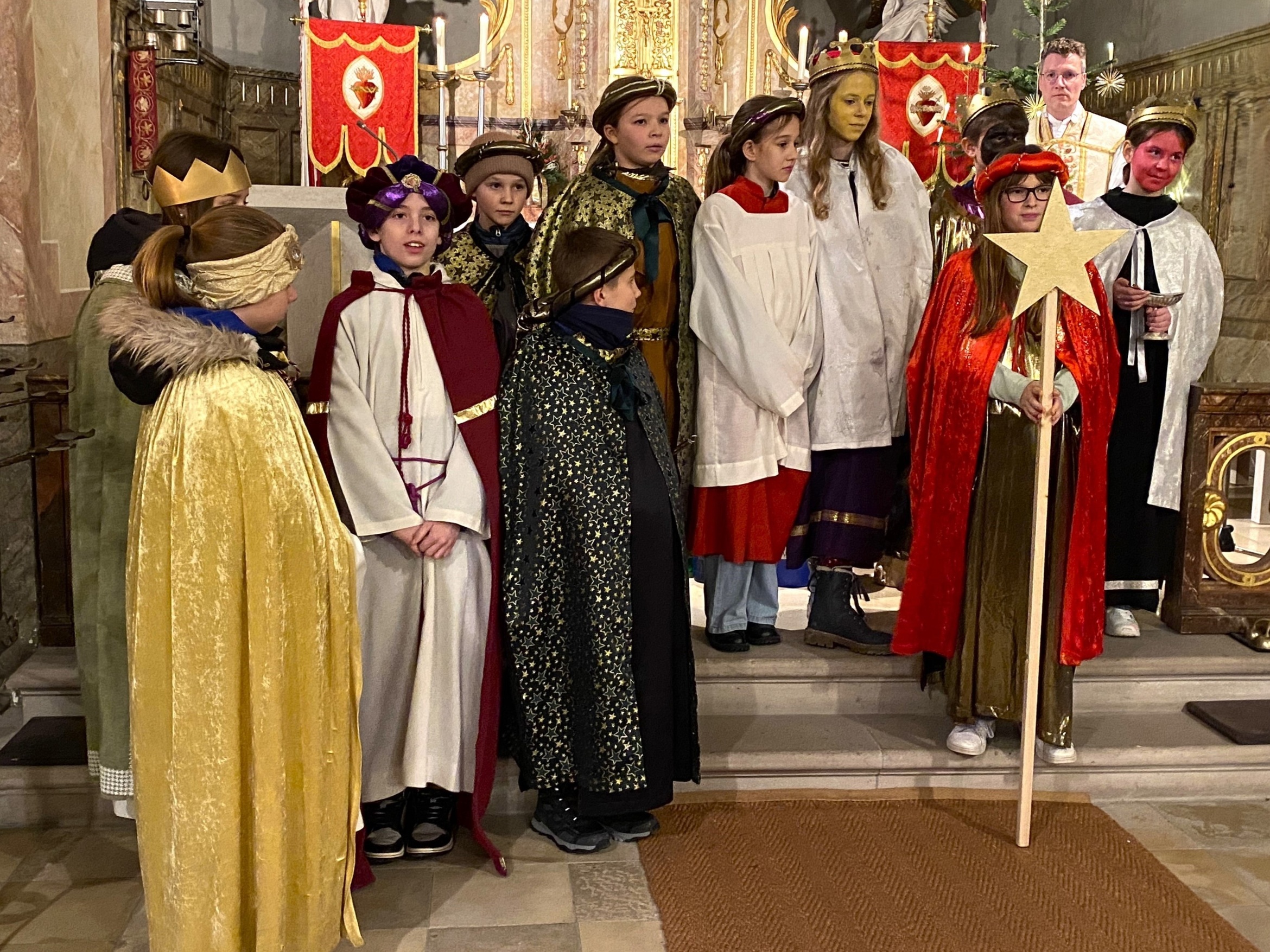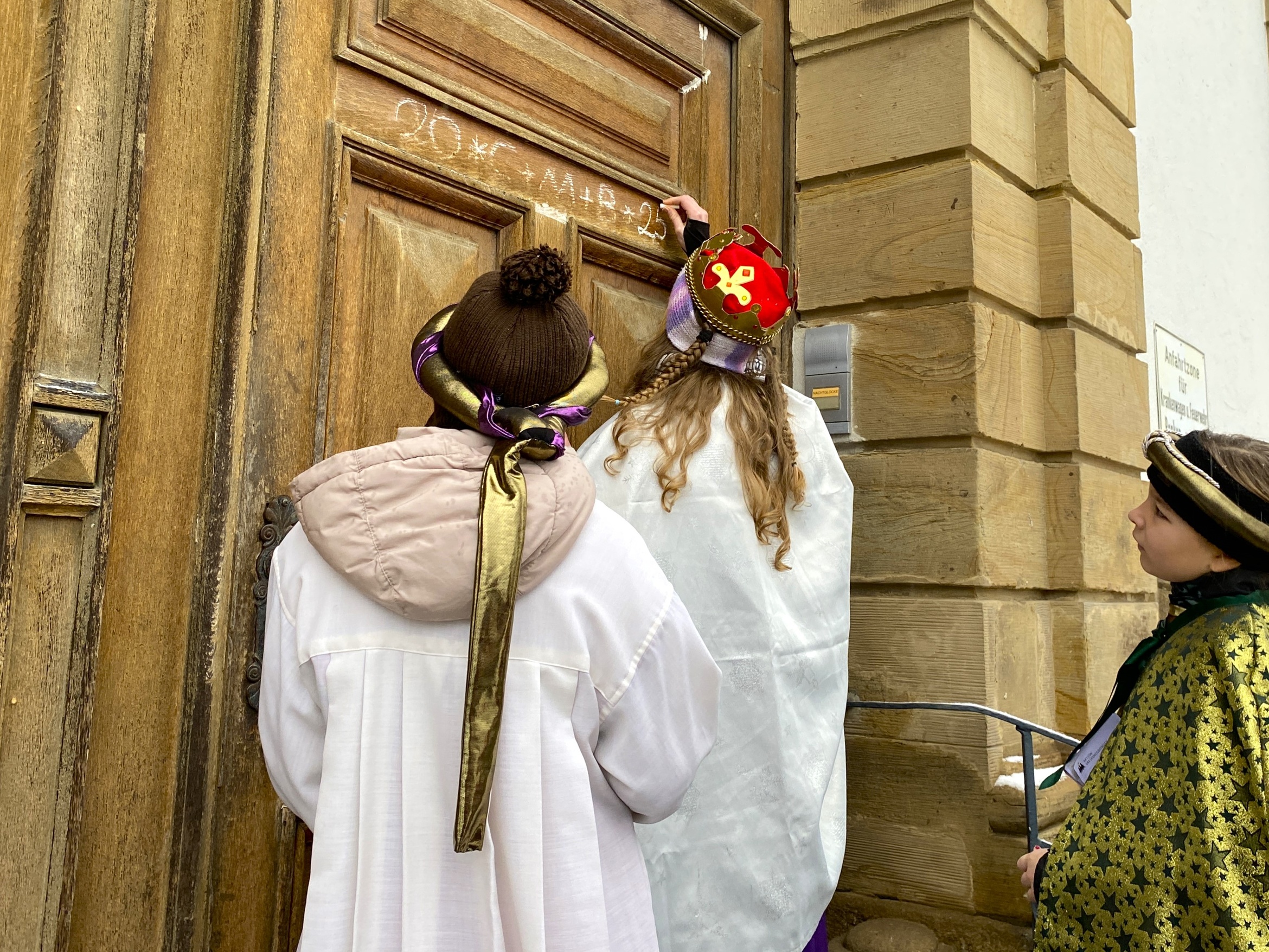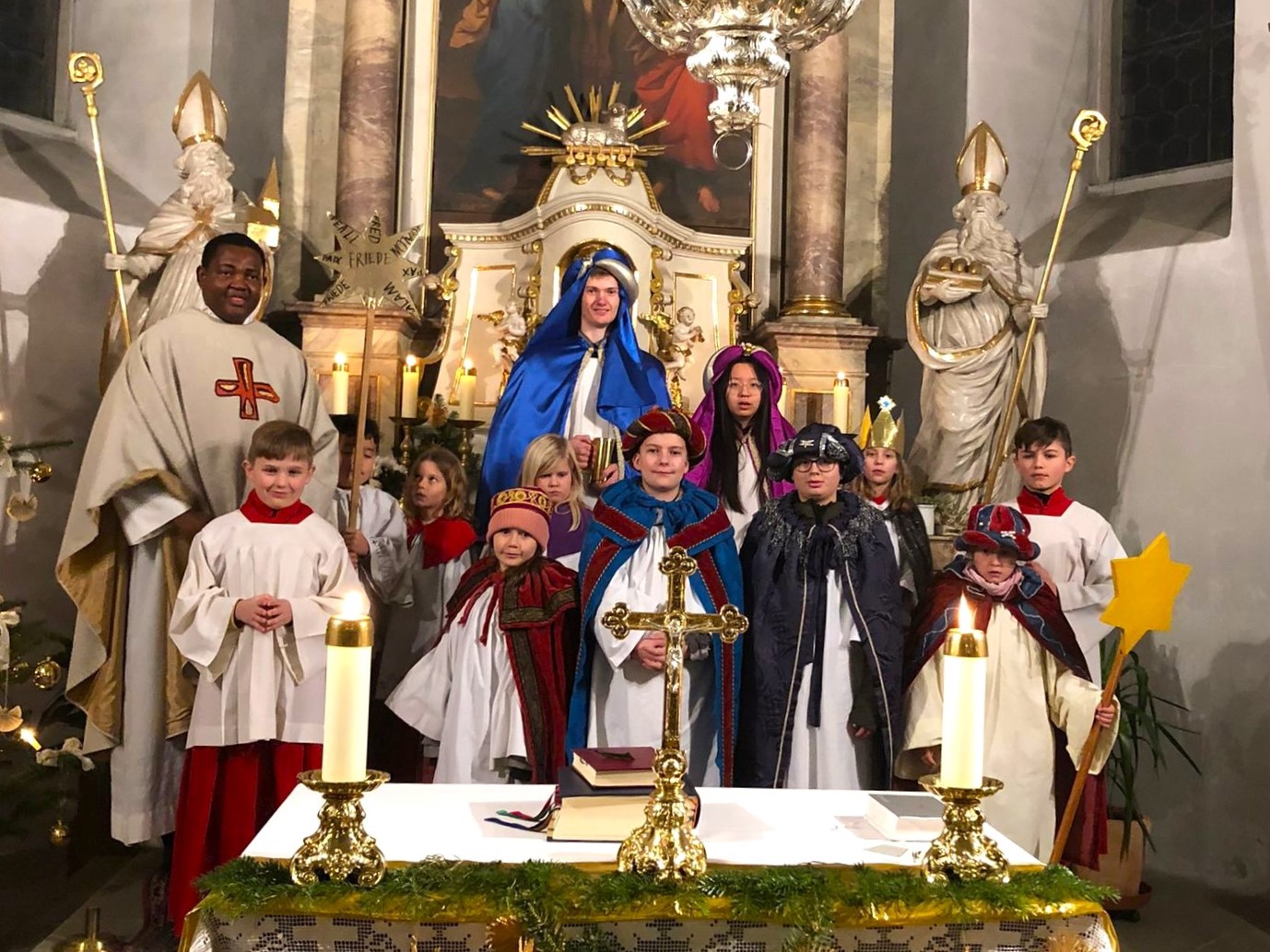 Die Frohe Botschaft von der Geburt Christi tragen die Sternsinger in viele Häuser. Gleichzeitig bringen die Kinder und Jugendlichen damit den Segen Gottes für das neue Jahr, den sie auch an viele Türen schreiben. Ausgangspunkt der Aktion ist das Evangelium von den Sterndeutern aus dem Osten, die zur Krippe nach Betlehem kommen. Pfarrer Daigeler sprach in den Messfeiern vom aufmerksamen Blick der Weisen aus dem Morgenland für die Zeichen Gottes, vom Mut eines weiten Weges und von der Großzügigkeit ihrer Gaben und Geschenke. Darin seien sie Vorbilder auch für unser Christsein.