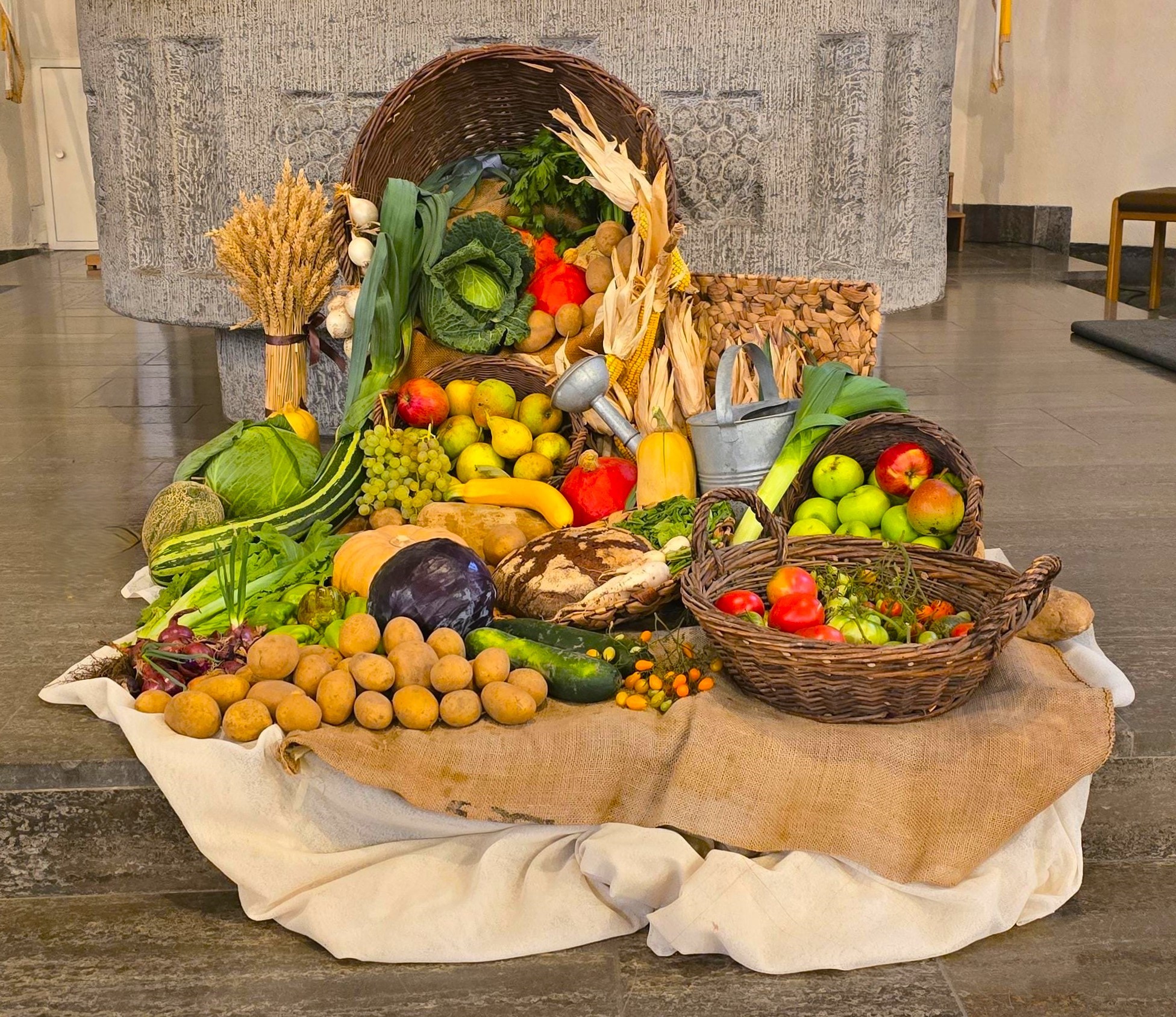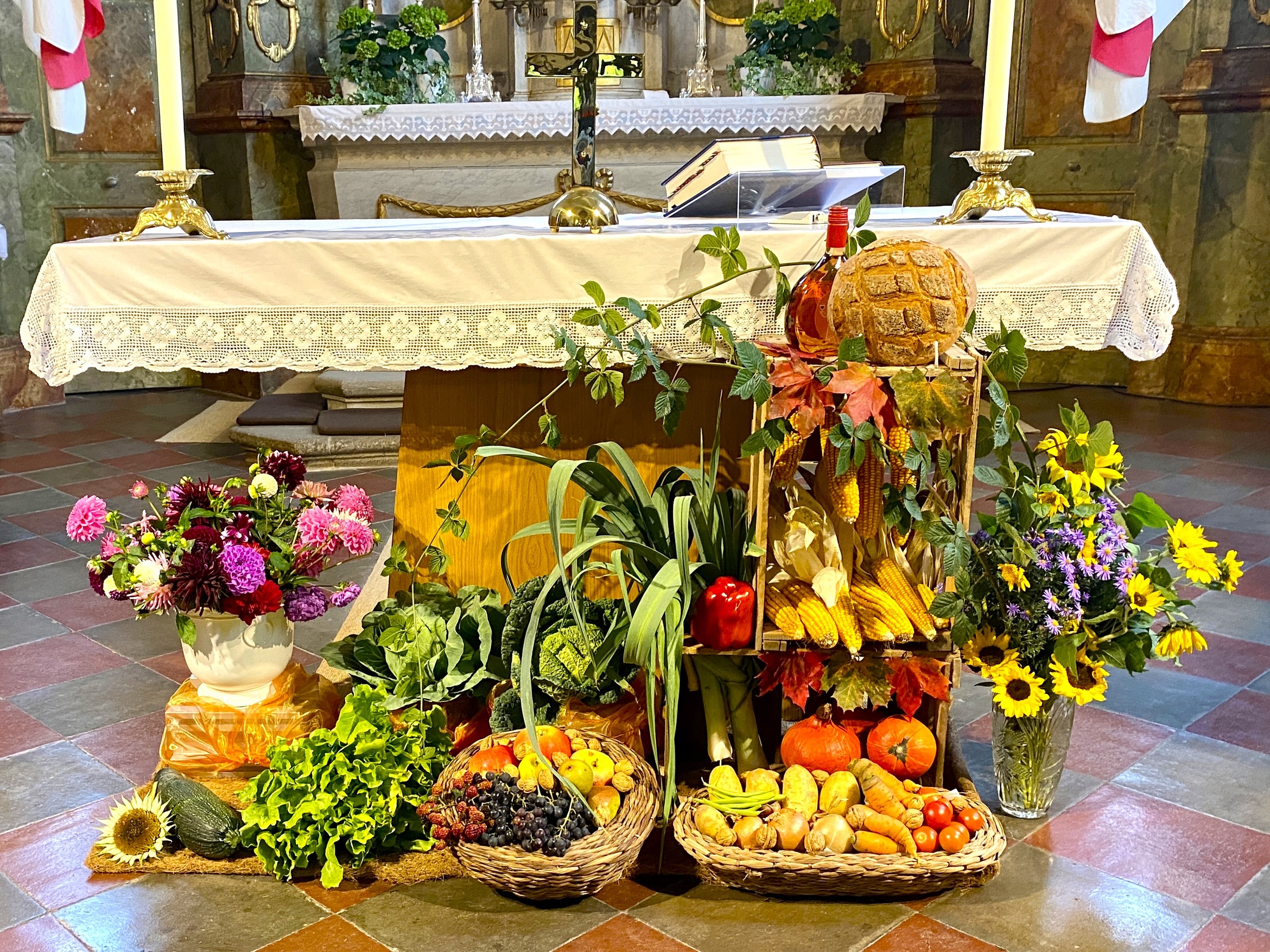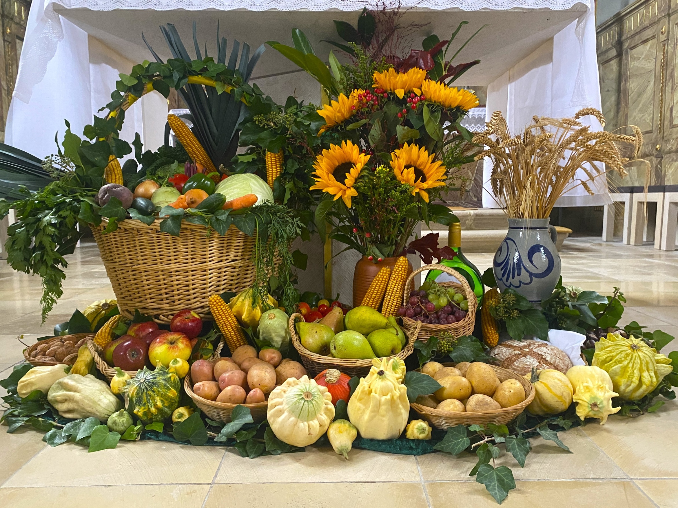 Prächtige Erntealtäre waren in unseren Kirchen von Ehrenamtlichen aufgebaut worden. Früchte, Gemüse und Blumen zeugen von der Schönheit der Schöpfung und dem Reichtum der Gaben Gottes. Erst in der Haltung der Dankbarkeit kann man sie wirklich genießen, indem man sich daran freut, indem man erkennt, dass nichts selbstverständlich ist, und indem man die Spuren von Gottes Güte darin sieht.