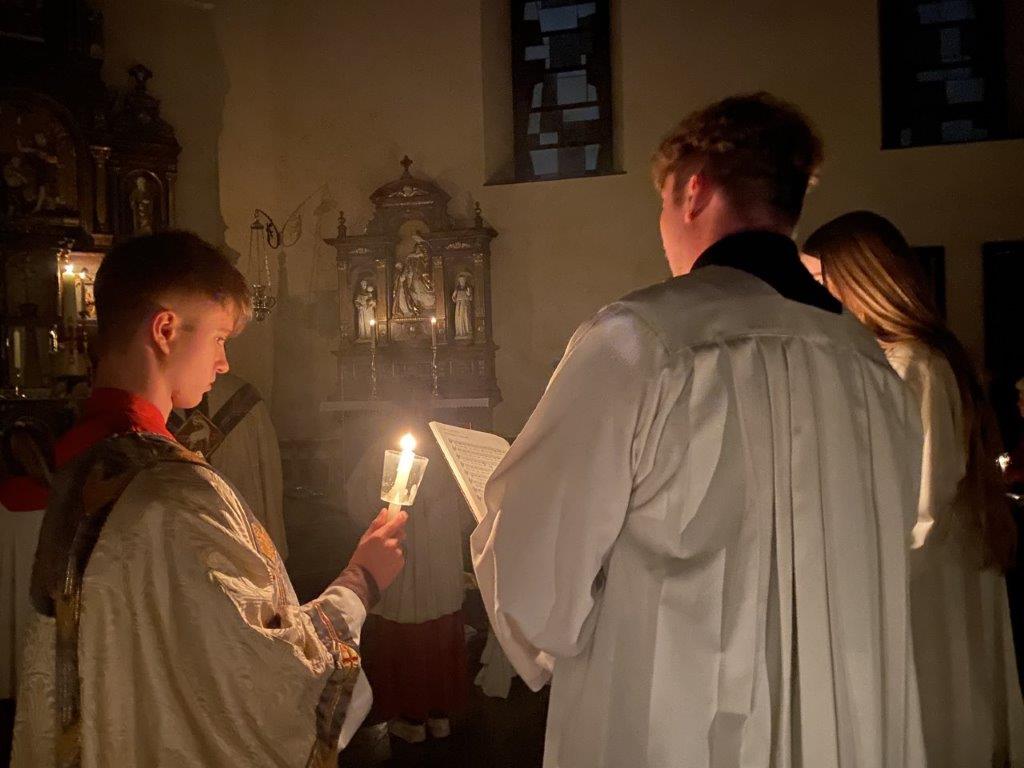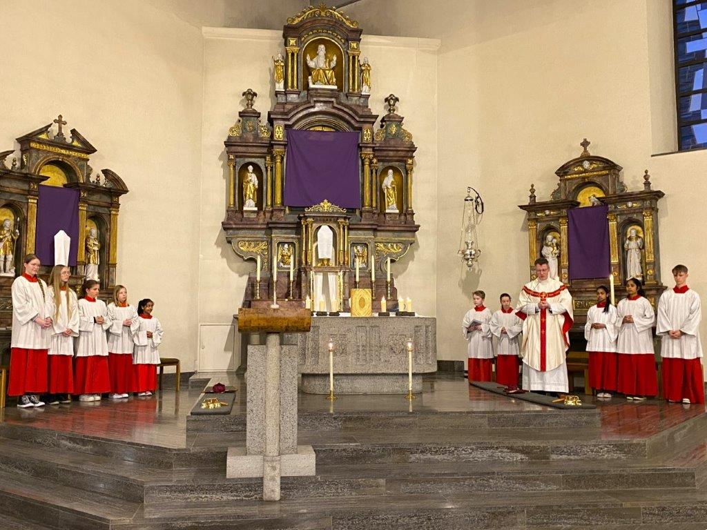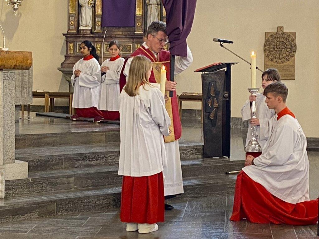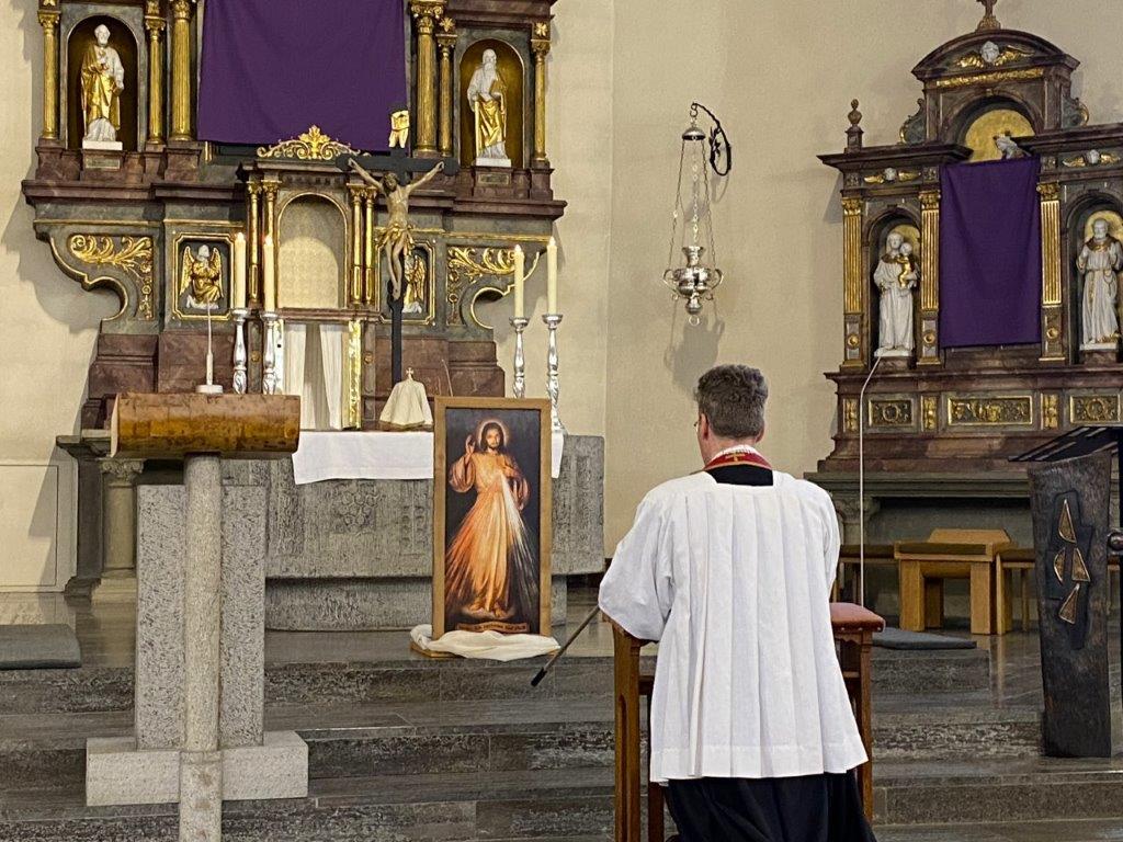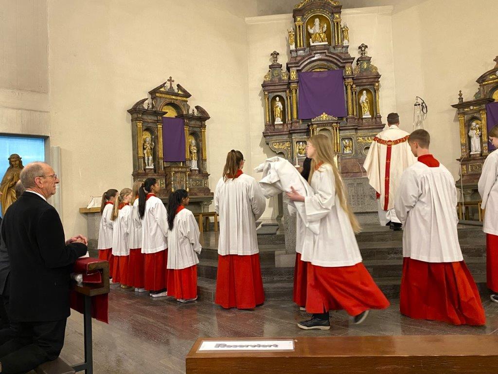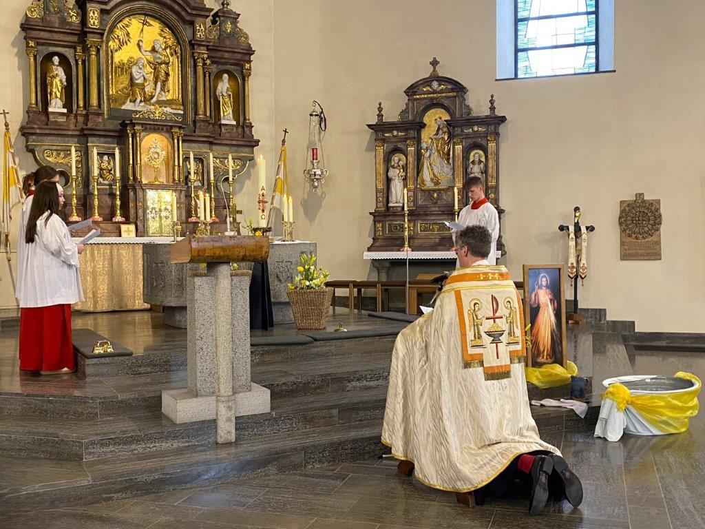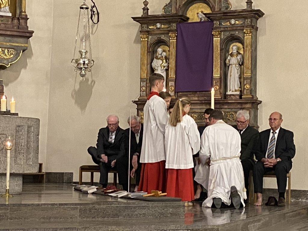 Die Messfeiern vom Letzten Abendmahl feierten die Dankbarkeit für das Geschenk der bleibenden Gegenwart Christi in der heiligen Eucharistie. Pfarrer Daigeler bedachte das in seiner Predigt, in der er über das Verständnis von "Gedächtnis" als Vergegenwärtigung sprach. Mancherorts wurde auch das eindrückliche Zeichen der Fußwaschung begangen, das zum demütigen Dienst aneinander auffordert. "Bleibet hier und wachet mit mir" sang das Gesangsensemble unter der Leitung von Jakob Keller, während die Altäre in der Johanneskirche entblößt wurde zum Zeichen für die Todesangst Christi.