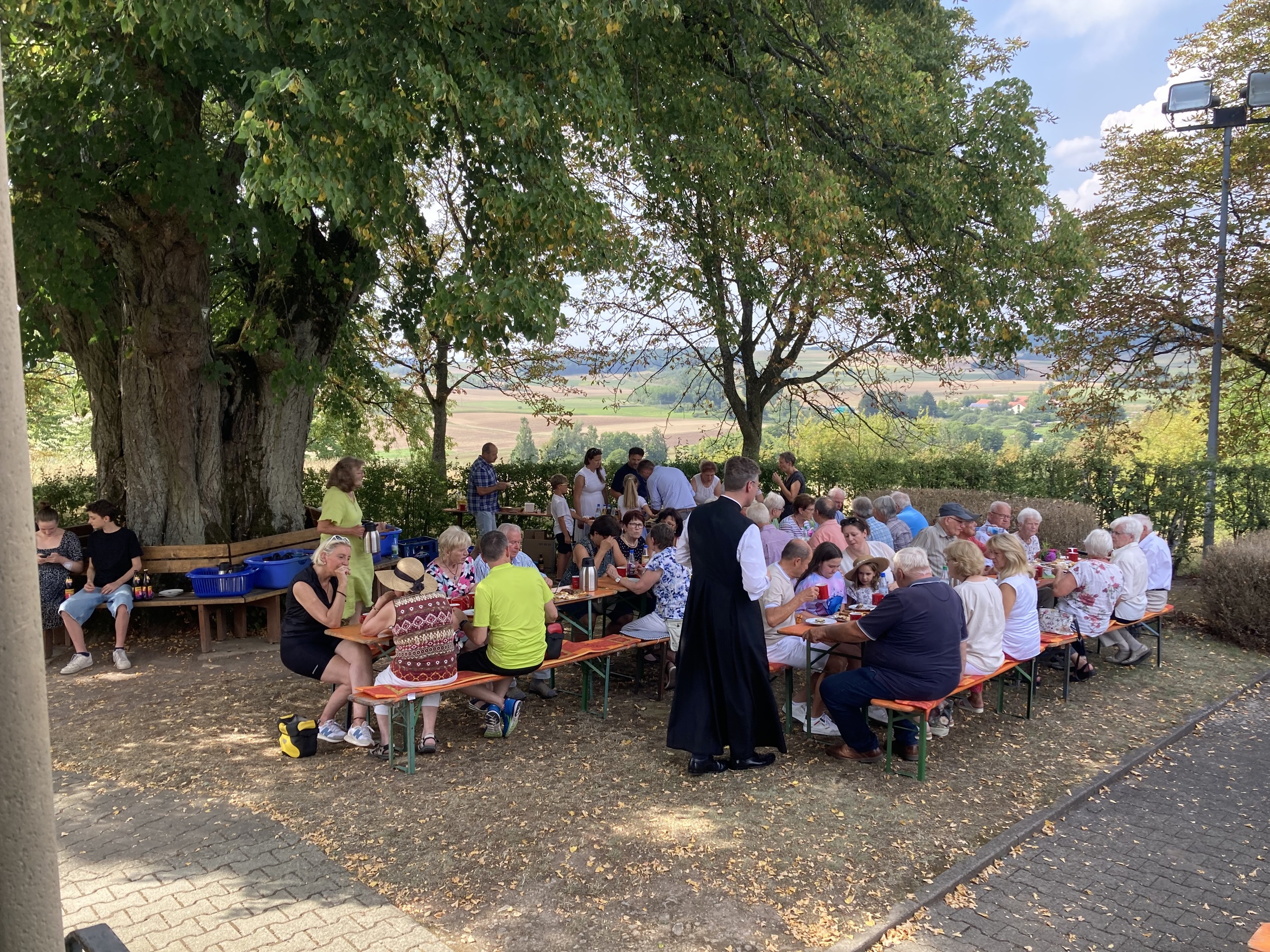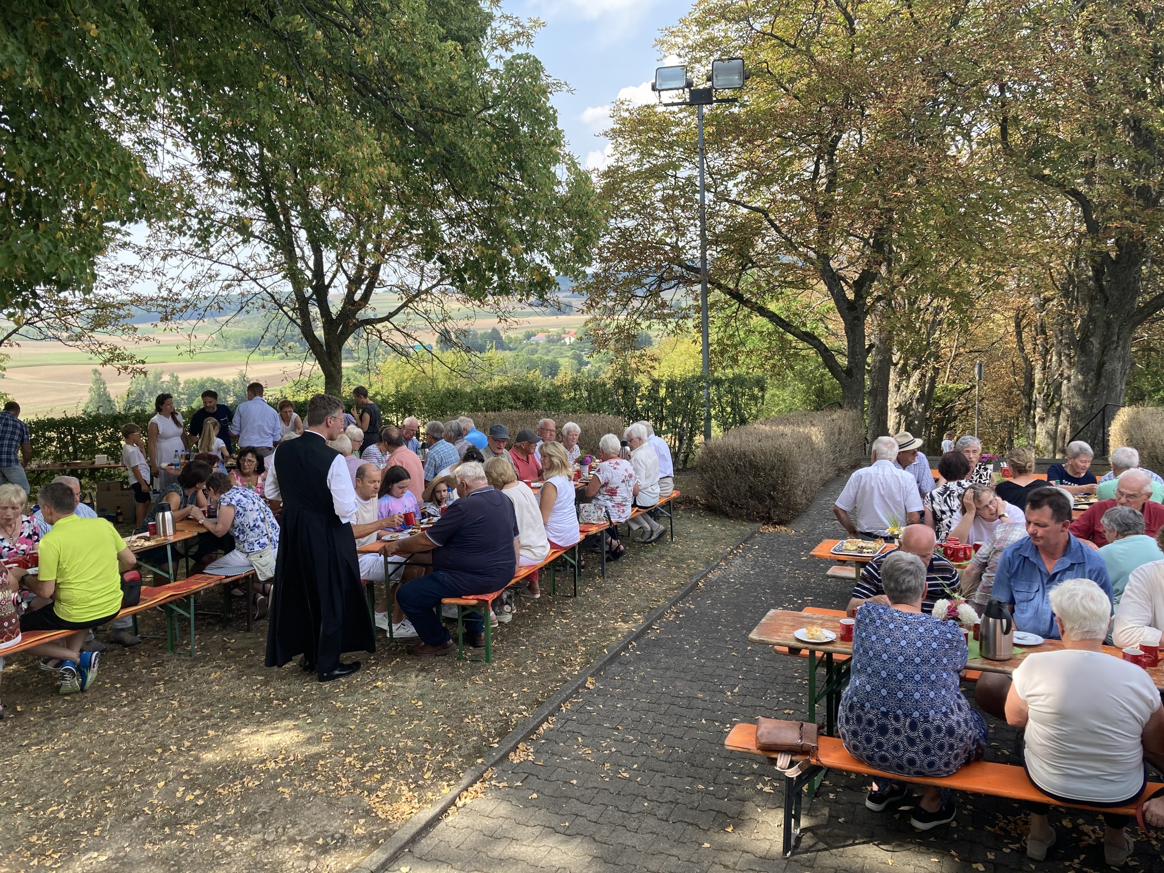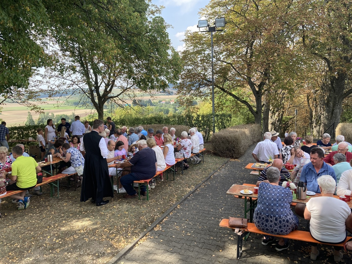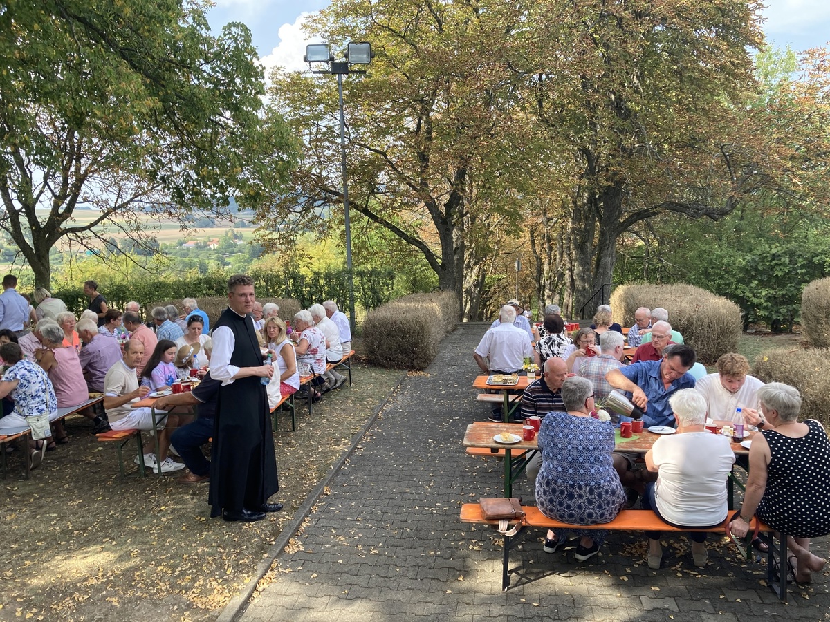 Am Nachmittag fanden sich in der Kerlachkapelle Gläubige zu einer Marienandacht ein. Bei großer Hitze hatten Mitglieder des Pfarrgemeinderats und der Kirchenverwaltung Kaffee und Kuchen für eine anschließende Begegnung vorbereitet. Im Schatten der Linde vor dem Marienheiligtum wurde das gerne angenommen.