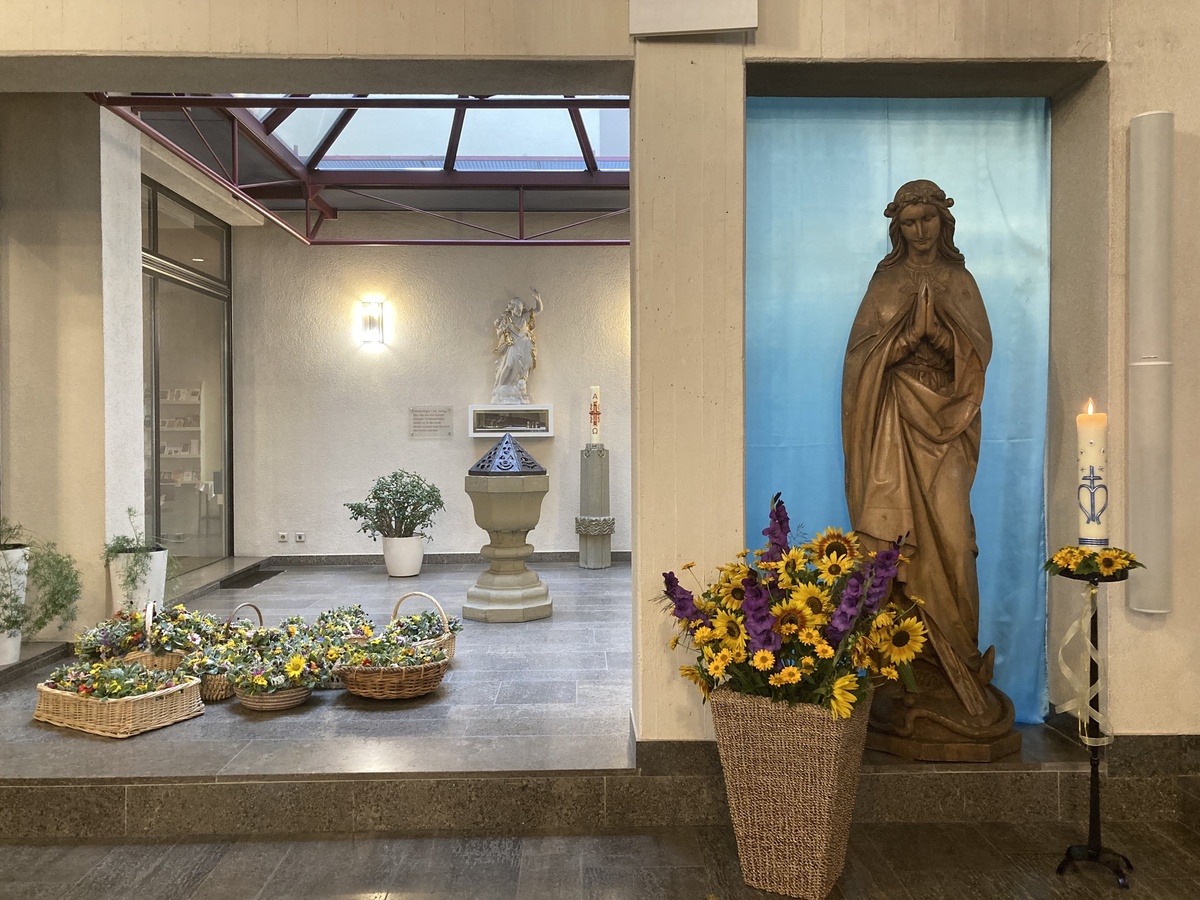 Nach dieser Festmesse zelebrierte Pfarrer Dr. Daigeler das Hochamt in Stadtlauringen. An der Orgel spielte Jakob Keller und Barbara Göpfert war als Kantorin aktiv. So war es ein überaus festlicher Gottesdienst, in dem Pfarrer Daigeler die Gottesmutter als Lehrmeisterin des Gottvertrauens darstellte. "Von ihr können wir die Sprache und die Schritte des Glaubens lernen." Am Ende der Messe wurden die bunten Sträuße geweiht, die Ausdruck christlicher Lebensfreude sein wollen.