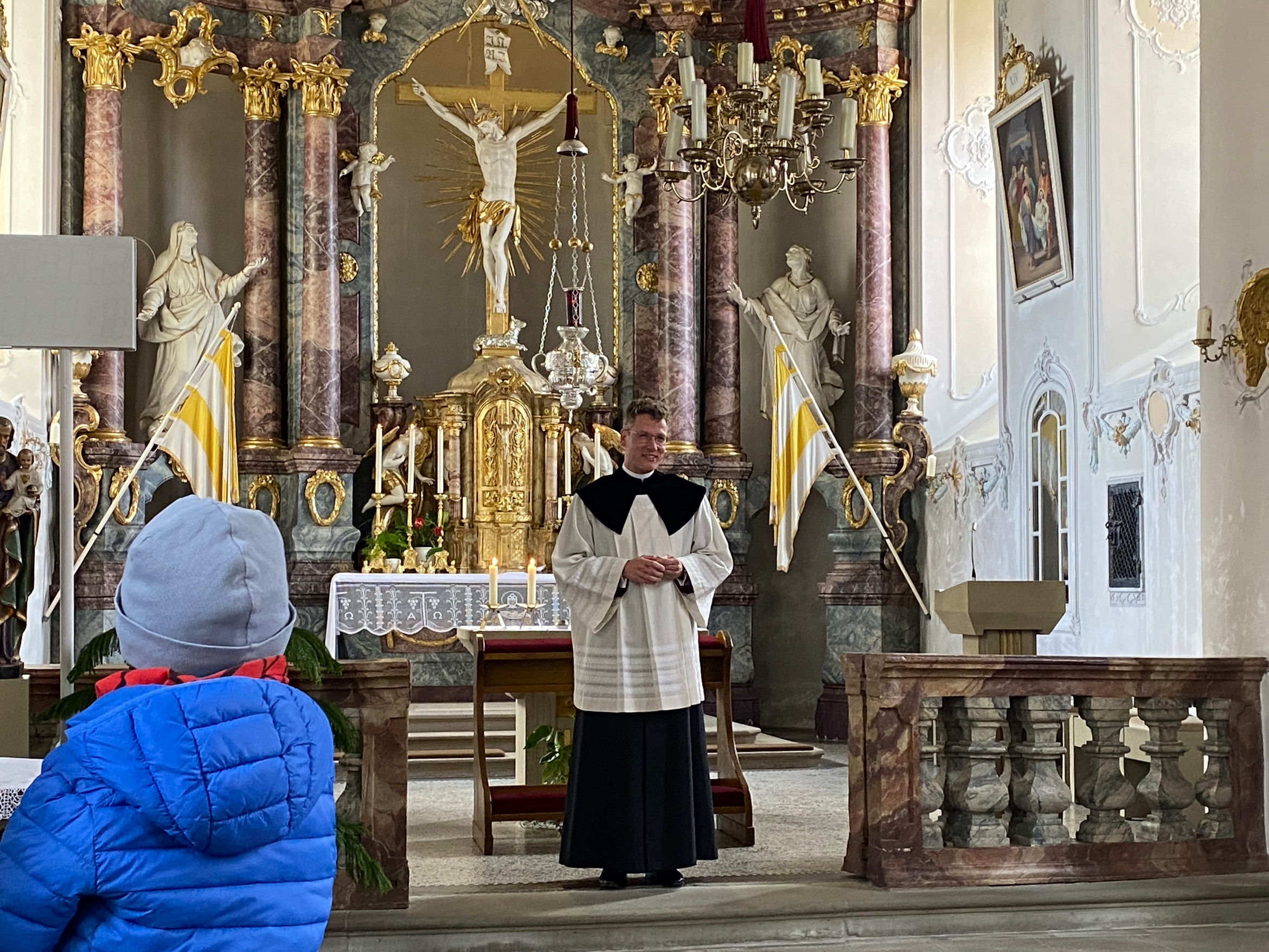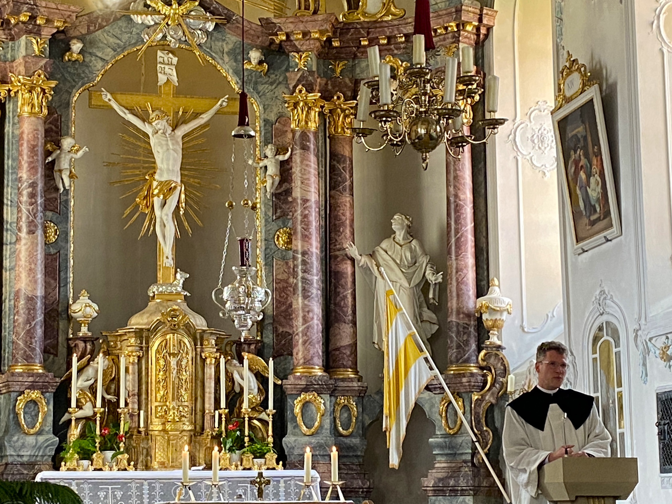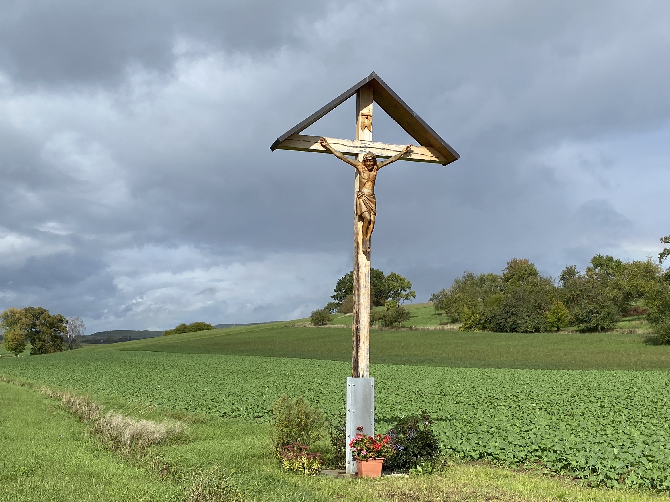 Seit der Wiedererrichtung eines Feldkreuzes zwischen Wettringen und Wetzhausen ist eine Andacht im September oder Oktober Brauch geworden. Aufgrund der herbstlichen Witterung fand sie heuer in der St. Kilianskirche statt. Begleitet von der Blaskapelle sangen und beteten die Gläubigen gemeinsam mit Pfarrer Dr. Daigeler.